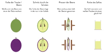 Frisch gepresst ist der Saft auch von roten Sorten klar. Das sind die Weißweine aus roten Sorten (blanc de noir, Weißherbst etc.).
