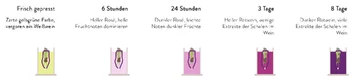Dauert der Kontakt länger, gehen immer mehr Farbstoffe in den Wein und nach einigen Tagen ist der Wein dunkel. Oder je nach Sorte der Beeren oder Reben auch tief dunkel.