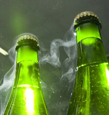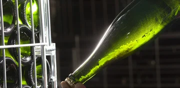 Ohne die richtige Rütteltechnik gelingt das nicht. Ist die Rüttelei gut gegangen, wird der Flaschenhals geeist und der Korken abgeschlagen. Der Hefe - Pfropfen schießt aus der Flasche. Der verlorene Inhalt wird mit dem Dosagewein aufgefüllt.