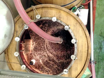 Oben im Bild wird die Maische auf der Domaine Dieulefit an der Rhône umgepumpt. Der Tresterhut bildet nach kurzer Zeit eine feste Schicht, der Saft ist nicht mehr in Kontakt mit den Schalen. Dieser Hut kann wie im Kochtopf umgerührt werden oder mit den Füßen herunter gedrückt werden. Oder man entnimmt unten im Tank den Saft um pumpt ihn nach oben wieder in den Tank, wobei er den Tresterhut auflockert.