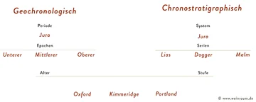 Die groben und kleinsten Raster haben in der Chronologie und Stratigraphie die gleichen Bezeichnungen. Nur das mittlere Raster (Epoche / Serie; Zeitraum ca. einige 10 Millionen Jahre) hat auch unterschiedliche Bezeichnungen (Unterer Jura / Lias).