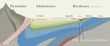 Das aquitanische Becken war immer wieder überflutet und ist im Laufe der Erdgeschichte immer weiter gesunken. Die Pyrenäen schoben später Richtung Norden und falteten den Süden Frankreichs stark. Das linke Ufer des heutigen Weingebietes Bordelais lag in dieser Zone der Senkung - wenn auch am Rande. Die heutigen Weinberge wurden von Schwemmland gebildet, dass an der Garonne aus den Pyrenäen und an der Dordogne aus dem Zentralmassiv herbeigeführt wurde.