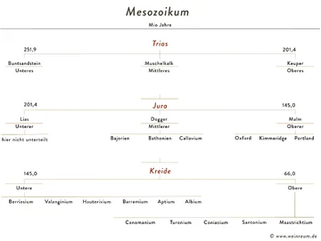 Während der rund 200 Millionen Jahre des Trias, Jura und Kreide war das Klima heiß und zudem feucht - ideale Bedingung für Lebewesen. Die Vielfalt der Tierwelt war sehr groß, es bildeten sich viele der sehr großen Saurier. In diesen Perioden gab es durch Meteore und Vulkane gewaltige Umbrüche durch das mehrfache Aussterben von mehrfach 2/3 aller Arten.