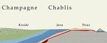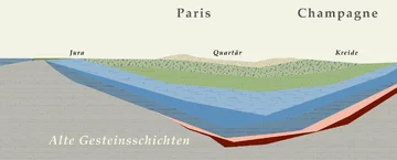 Kreisförmig liegen die Ränder dieses Pariser Beckens, etwa 200 km von Paris entfernt. In der Champagne haben sich die mächtigen Kreideschichten gebildet, die den Boden für die Reben bilden und die charakteristischen Keller der Champagne bilden, in denen die Flaschen reifen.
