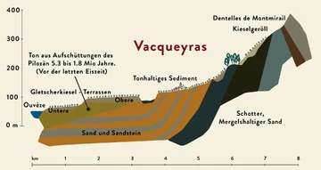 Der Boden wurde in der Region unterschiedlich verworfen, auf engem Raum wechseln Boden, Ausrichtung und Lage der Weinberge, was den Weinen der vielen Cru Lagen um Vacqueyras jeweils ihren eigenen Charakter verleiht und sie daher alle so hoch bewertet sind.